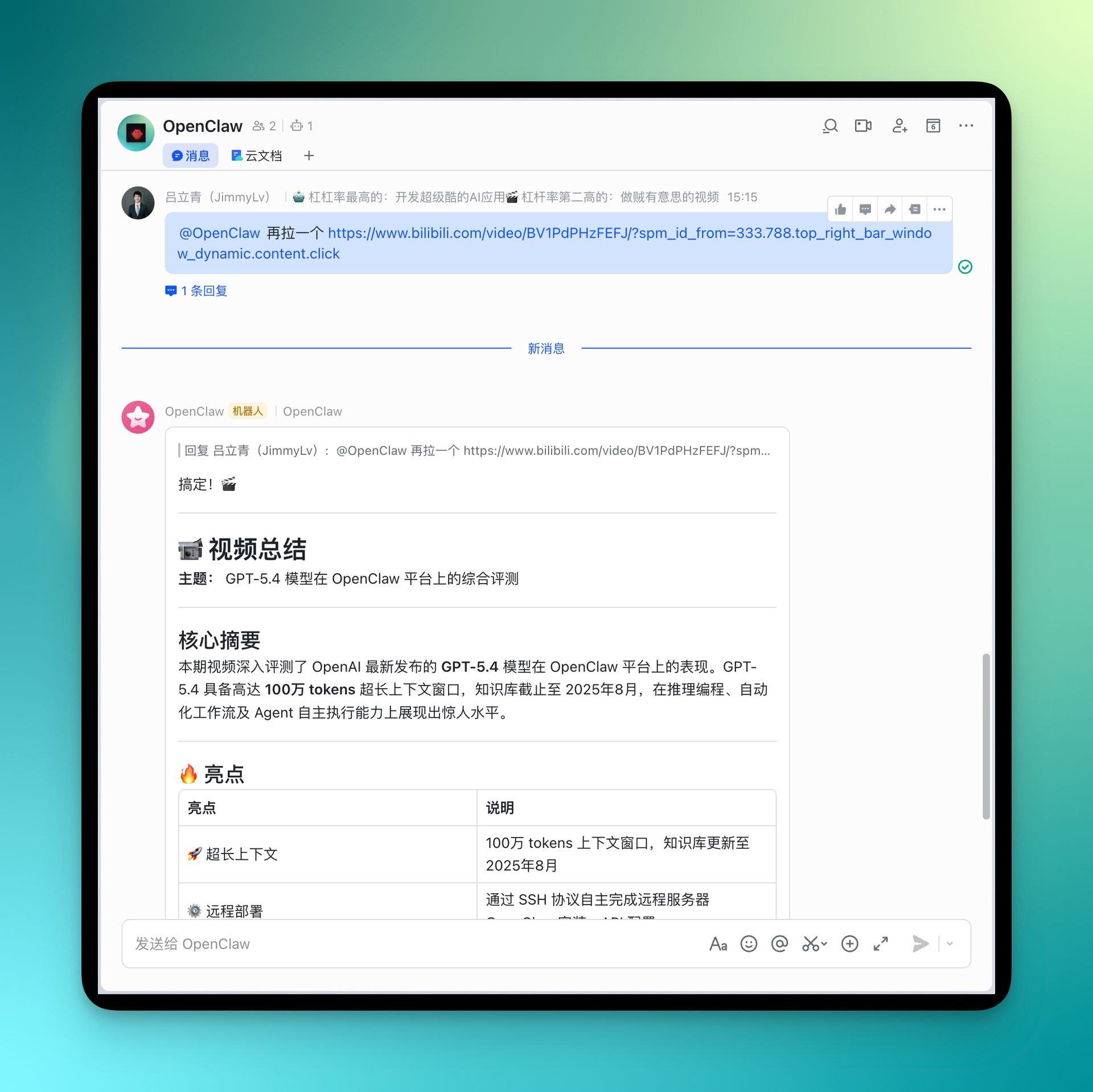 OpenClaw bibigpt-skill integration demo: Bilibili AI video summary in action